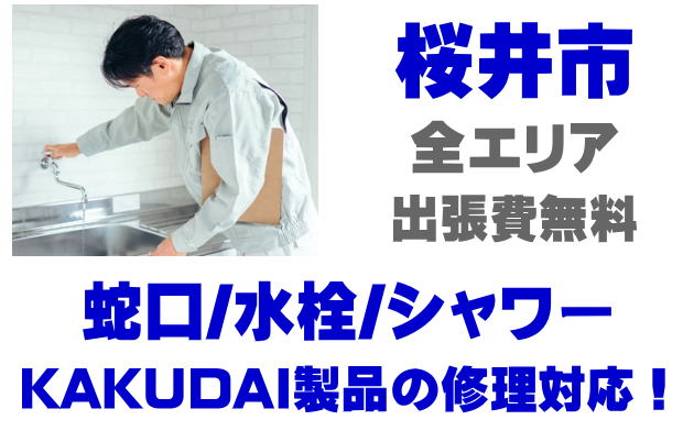 桜井市で水栓メーカーKAKUDAIの修理業者をお探しなら当社までお気軽にお問い合わせください。蛇口の水漏れ、シャワーの故障などカクダイ製に関するトラブルなら何でもご相談ください。